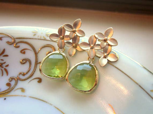 Peridot Apple Green Gold Cherry Blossom Earrings