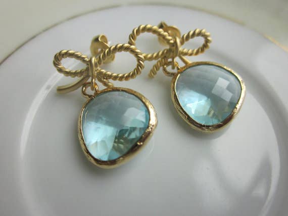 The aquamarine gems are 13mm X 17mm. The gold bows measure 18mm X 10mm and are matte gold. The stud posts are sterling silver. The earrings are very dainty and measure under an inch long.