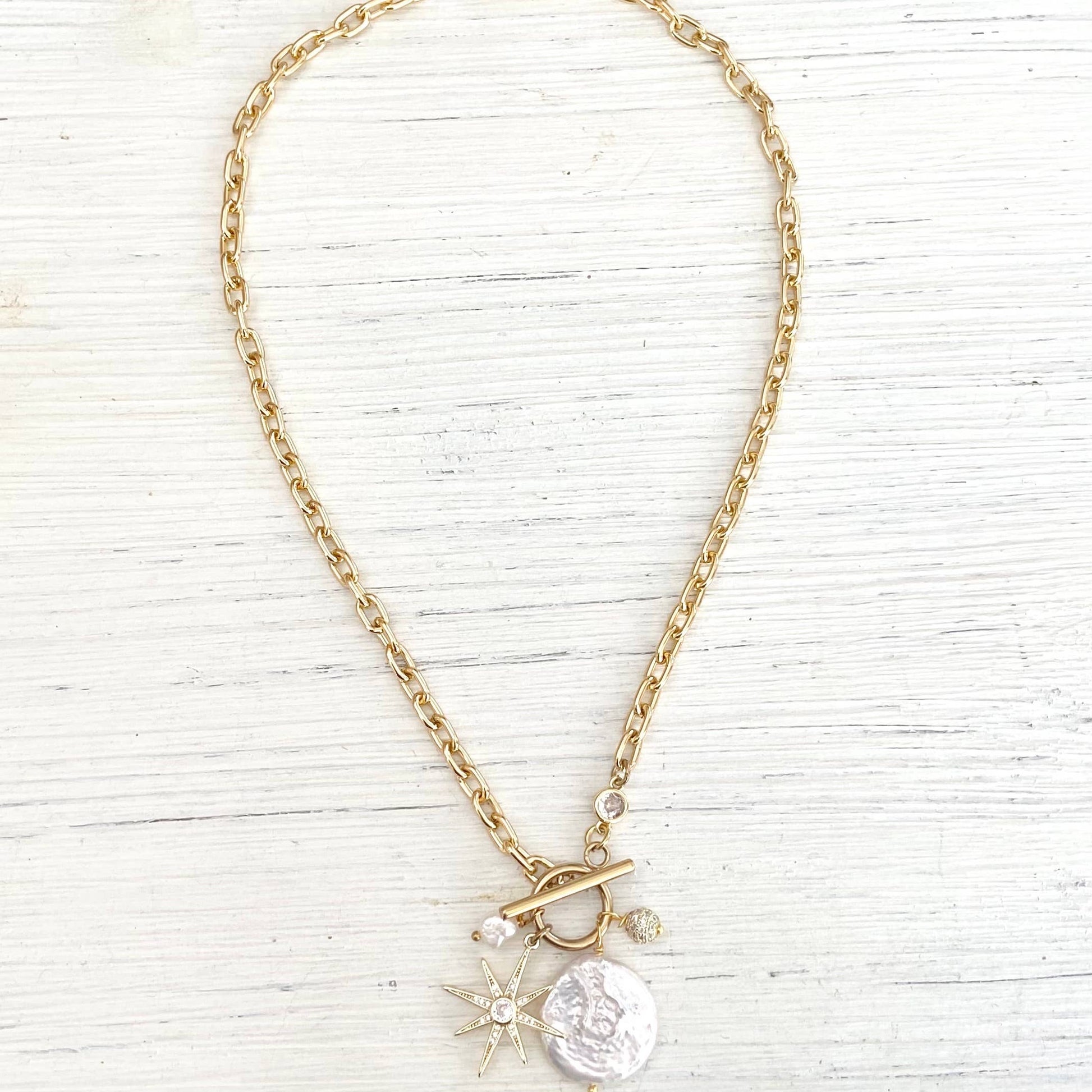 Elevate your style with this enchanting charm necklace, blending timeless elegance with celestial sparkle. The gold-plated chain features a chic toggle clasp adorned with a collection of dazzling charms: