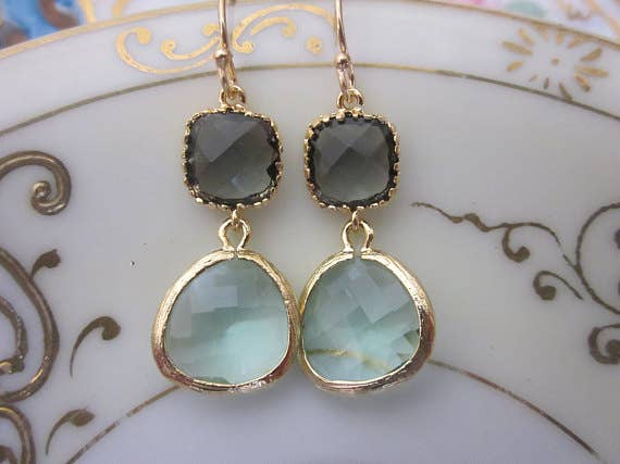 Prasiolite is a light green transparent color. The gems are 13mm with 5mm at the thickest part. The black blocks are 9mm with 3mm thickness. All of the gems are 16k gold plated. The earwires are 14k gold filled.