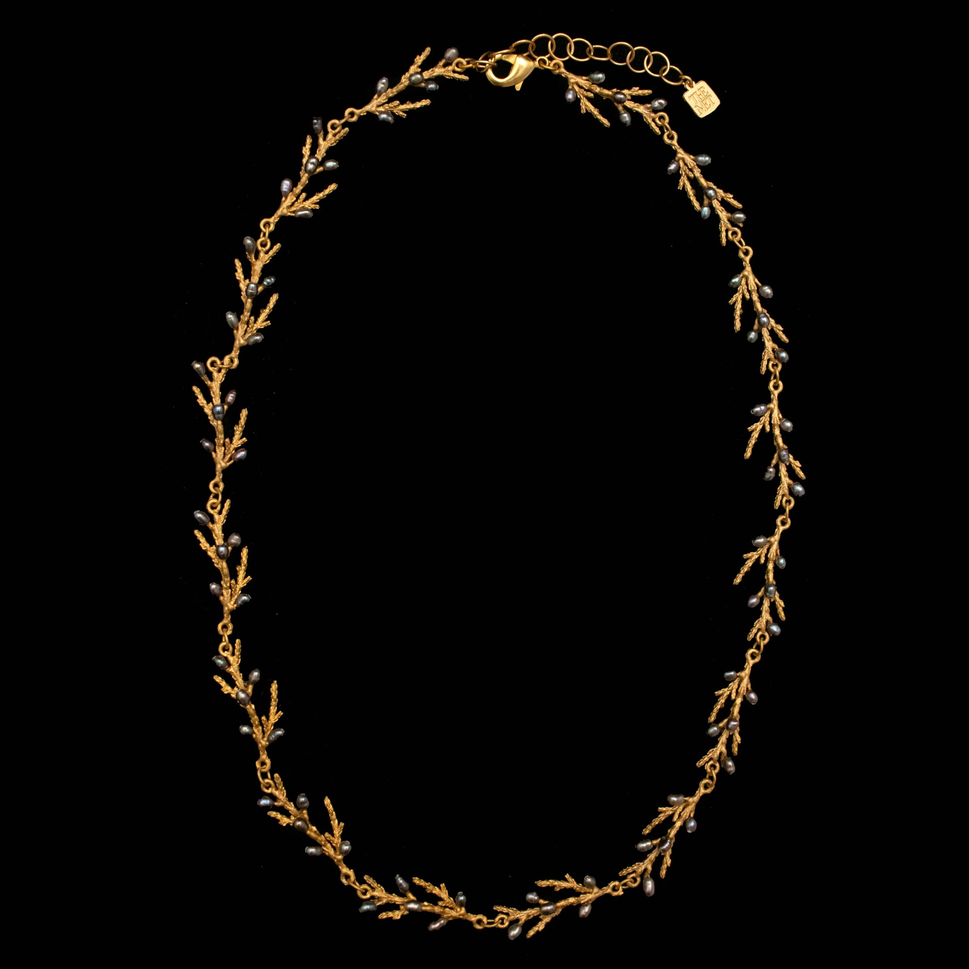 Cast bronze with a 24k gold finish. Accented with peacock pearls.