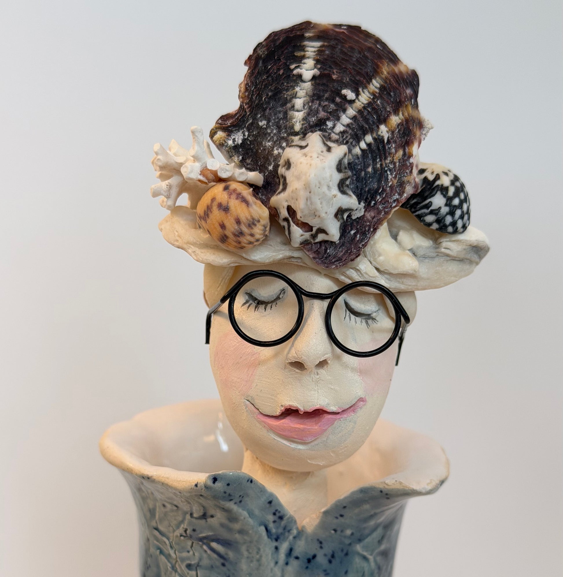 “Barnacle Babe” Handmade ceramic sculpture that functions also as a vase to display a few springs of your favorite delicate flowers. Barnacle Babe sculpture/vase in cadet blue base with removable glasses. 8” tall.