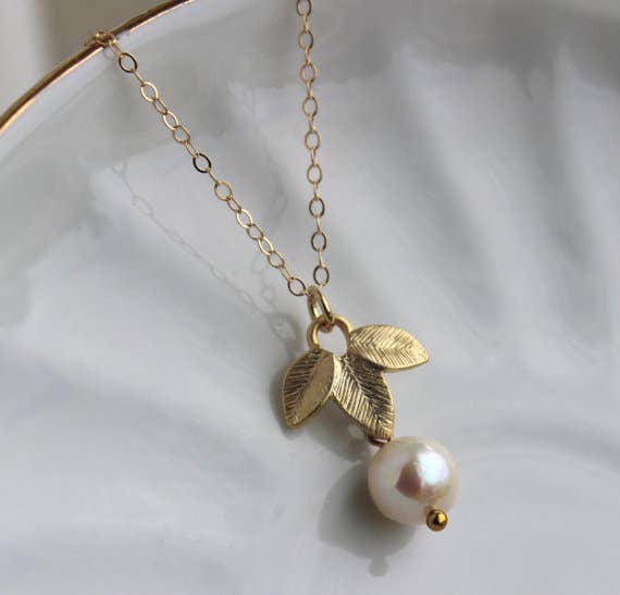 The pearl is round, white, and so lovely. It measures 9mm. The three gold leaf connector is matte gold and measures 16mm by 13mm. The chain is 14k gold filled - the links measure 1.4mm by 2mm. It is very dainty and adorable.
